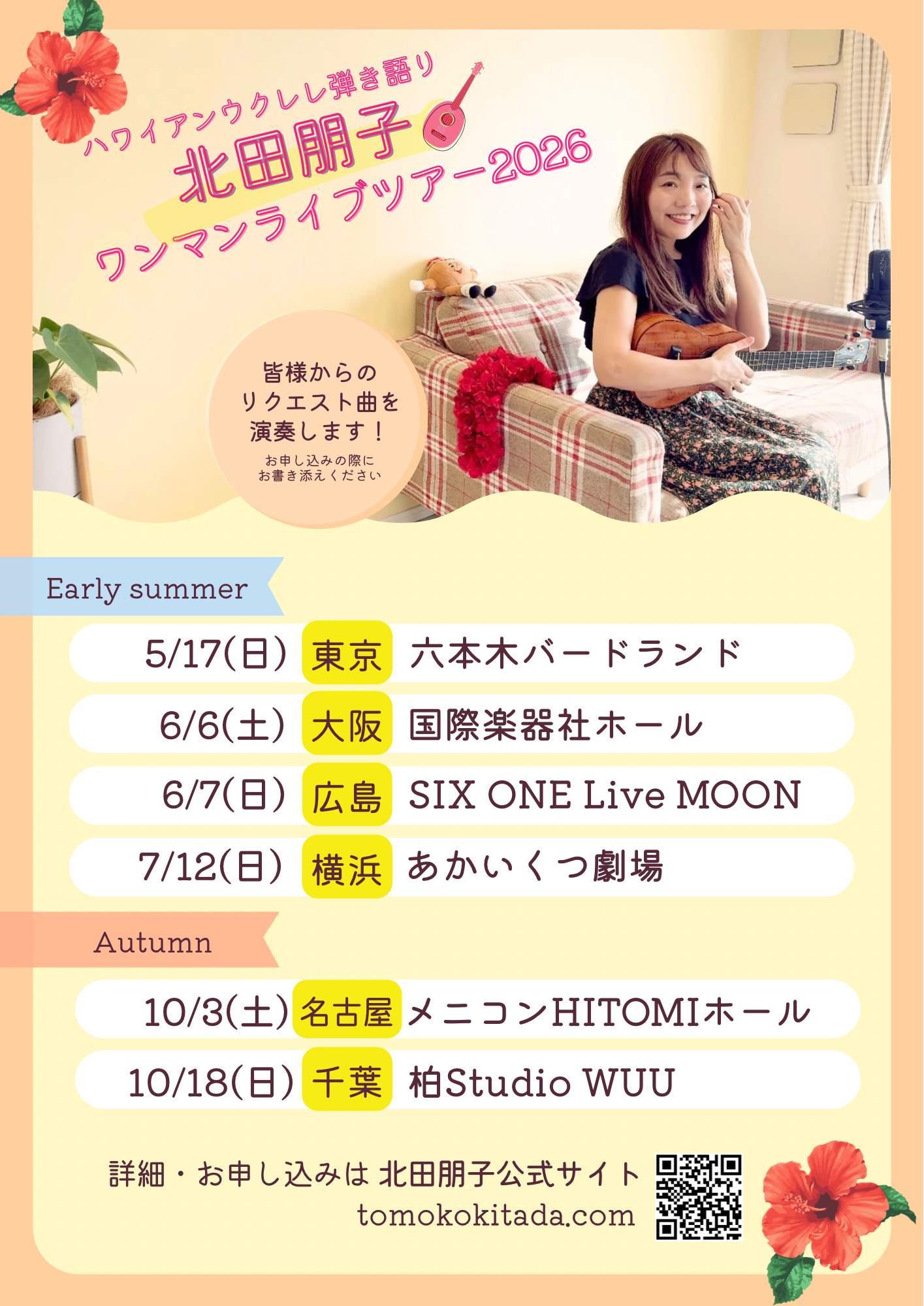 北田朋子ワンマンライブツアー2026 2026 2/28 2026.6.7(日) ハワイアンウクレレ弾き語り 出演 北田朋子 開場/開演 14:00 / 14:30 料金 チケット:3,000円 ※別途ワンドリンク代¥600 チケット販売 お申し込みはコチラから お問い合わせ LIVE Information | Tomoko Kitada | 北田朋子 Offical Website HBGポピュラーLIVE 渡會将士 Day Camp 2026
