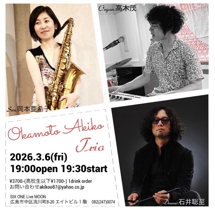 | 出演 | Sax.岡本亜希子 / Organ.高木茂 / Drums.石井聡至 |