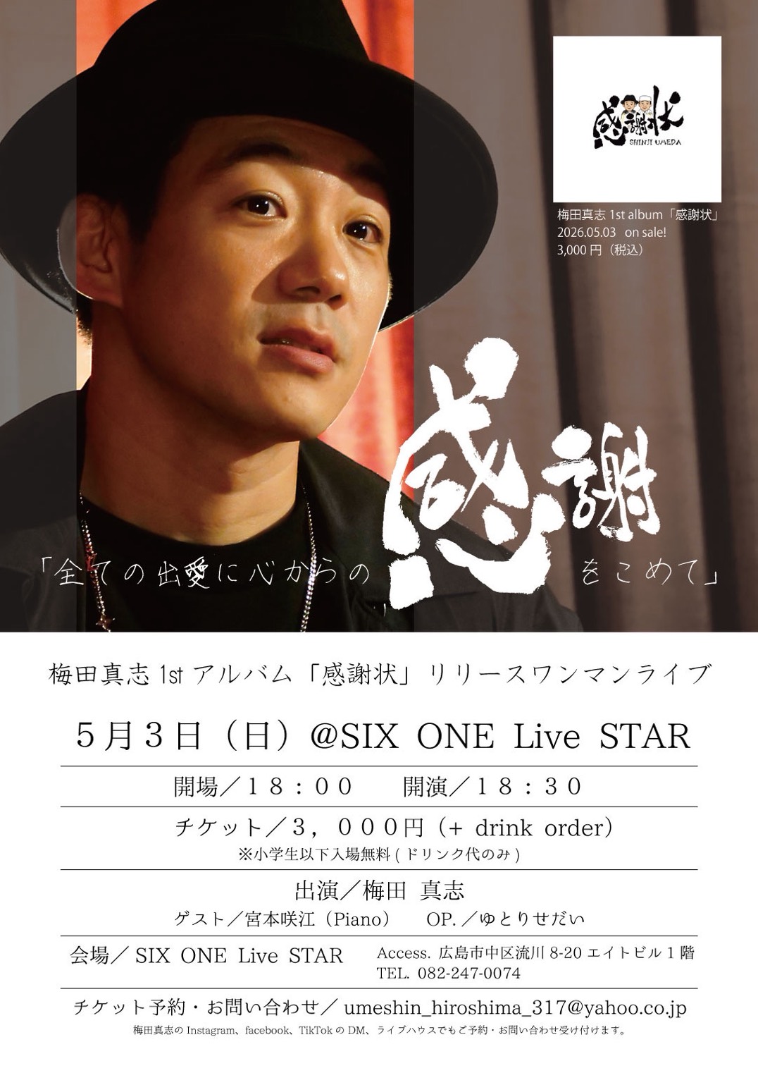 | お問い合わせ | umeshin_hiroshima_317@yahoo.co.jp SIX ONE Live STAR:082-247-0074 |