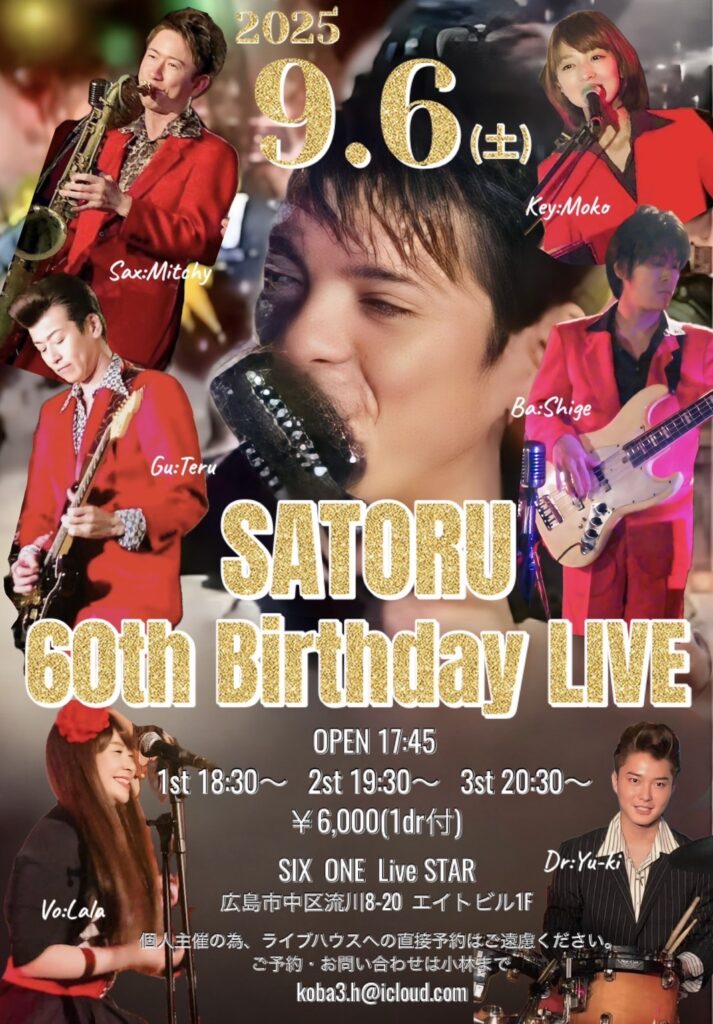 SATORU 60th Birthday LIVE 2025 8/17 2025.9.6(土) 開場/開演 17:45 / 18:30 料金 ¥6,000(1dr付) お問い合わせ koba3.h@icloud.com NANIMONO 3rd ALBUM RELEASE TOUR 『Kawaii Future IDOL』 おちゃメンタル☆パーティー ただいま広島!遠山澪香 凱旋公演