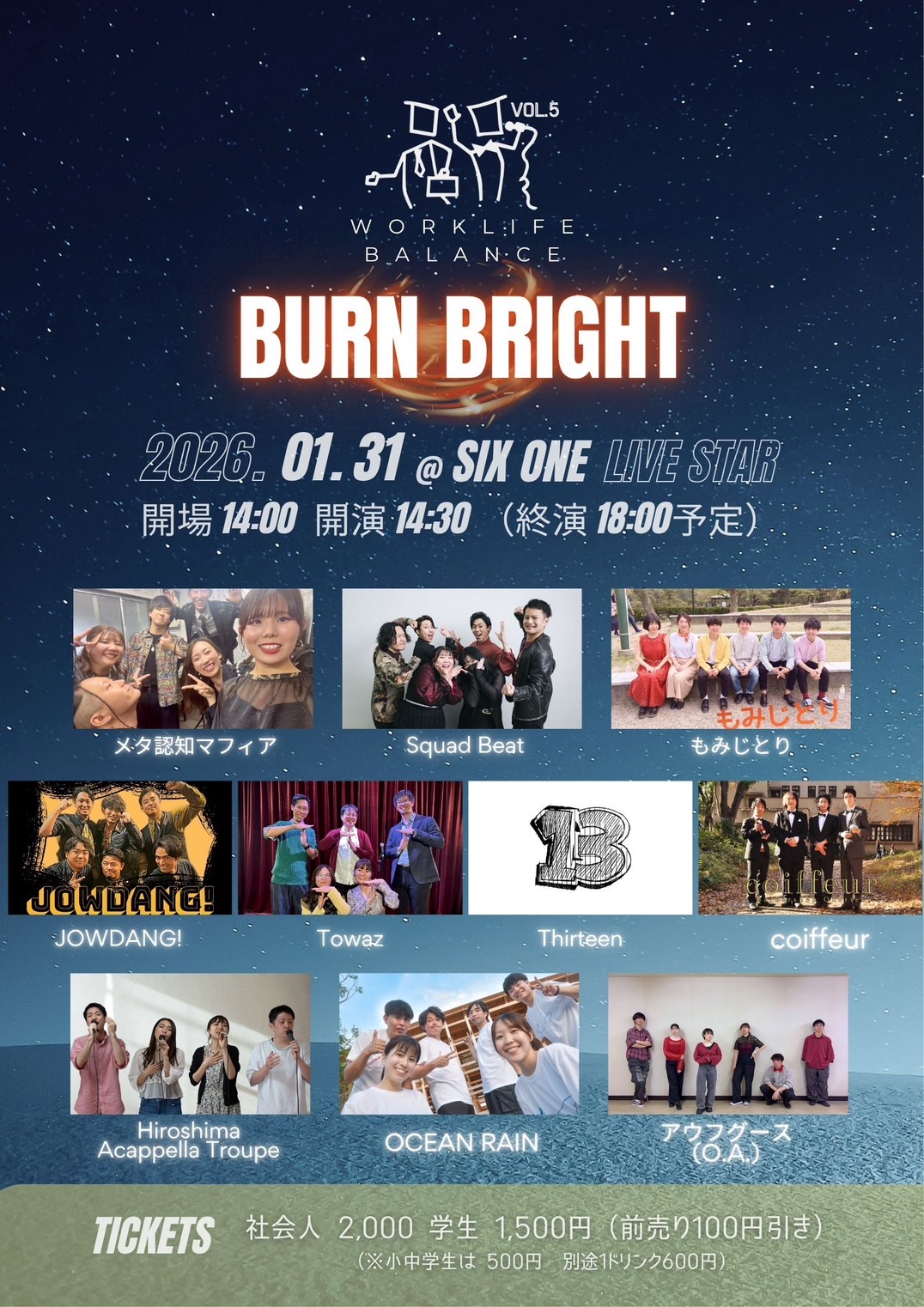 | 出演 | メタ認知マフィア / Squad Beat / もみじとり / JOWDANG! / Towaz / Thirteen / coiffeur / Hiroshima Acappella Troupe / OCEAN RAIN / アウフグース (O.A) |